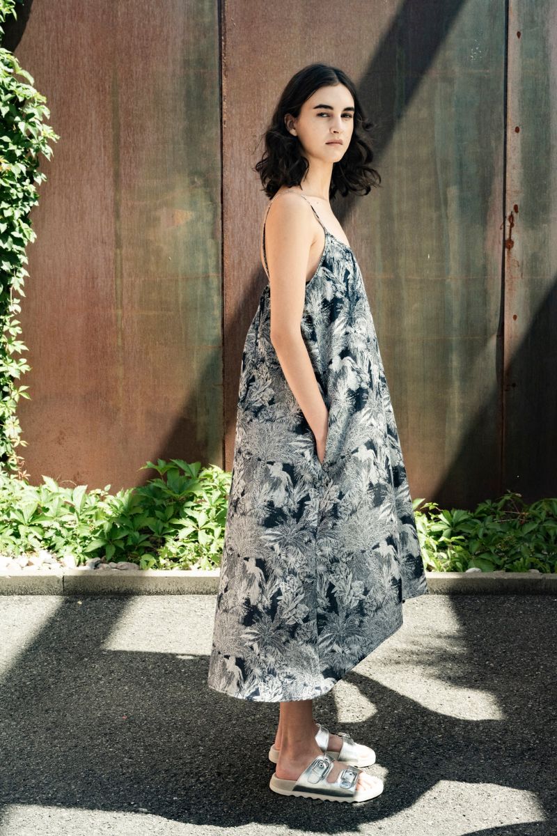 Ideal for beach outings, brunch dates, or casual errands, this dress transitions effortlessly between occasions. The tropical pattern stands out while maintaining a relaxed vibe. the entire dress was designed and manufactured in Montreal, Canada, creating jobs for the local economy.
