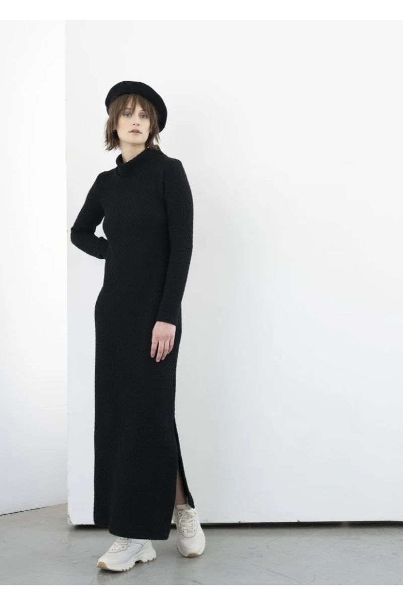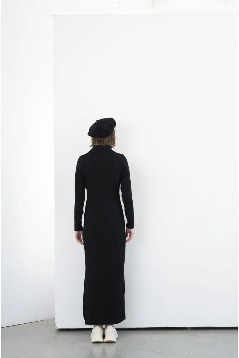 Crafted for versatility, the Black Gilmour Maxi Dress from BODYBAG by Jude, combines classic design with modern flair. Featuring a cozy turtleneck collar, long sleeves, and a subtle side slit, this knit dress offers both warmth and sophistication. Perfect for casual outings or elevated events, its Boing Knit fabric ensures a flattering, body-skimming fit. Designed and manufactured in Montreal, Canada, supporting local craftsmanship, preserving the nation’s economy.