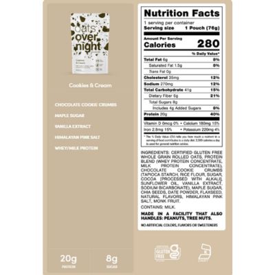 | Includes | Chocolate Cookie Crumbs Maple Sugar Vanilla Extract Himalayan Pink Salt Whey/Milk Protein 20g protein 8g sugar |