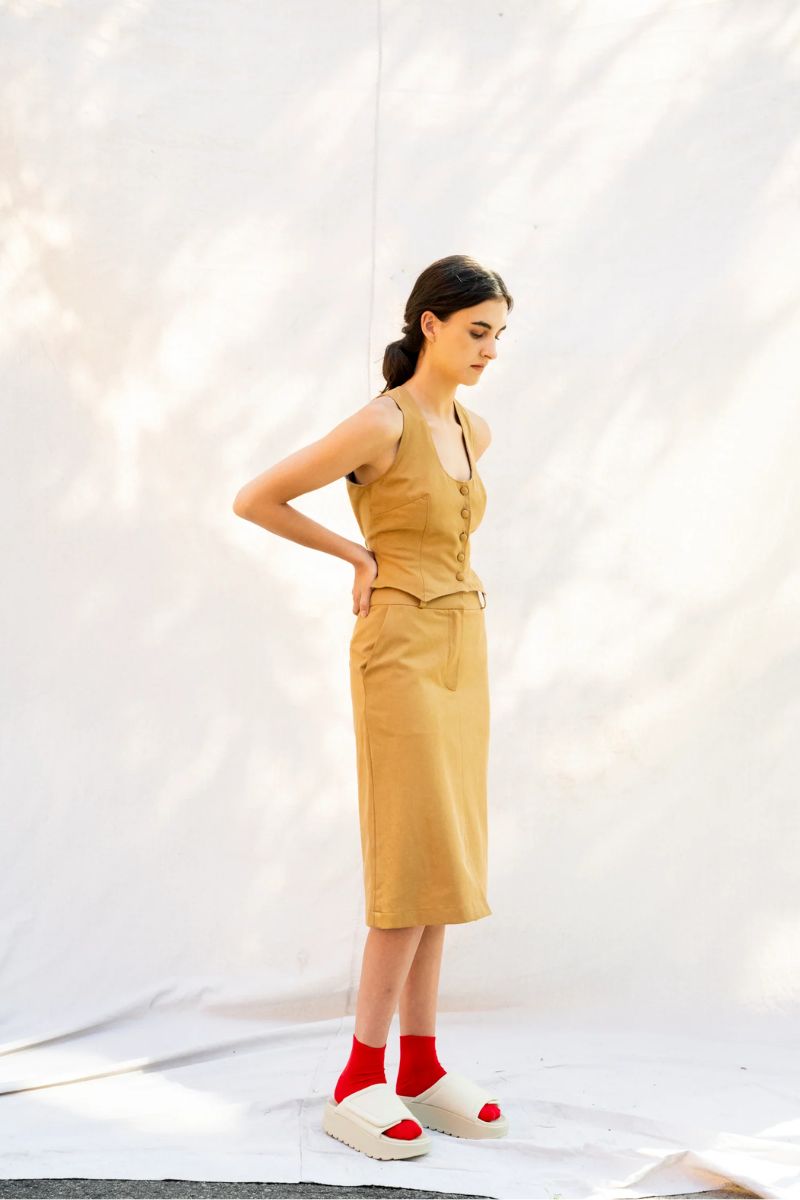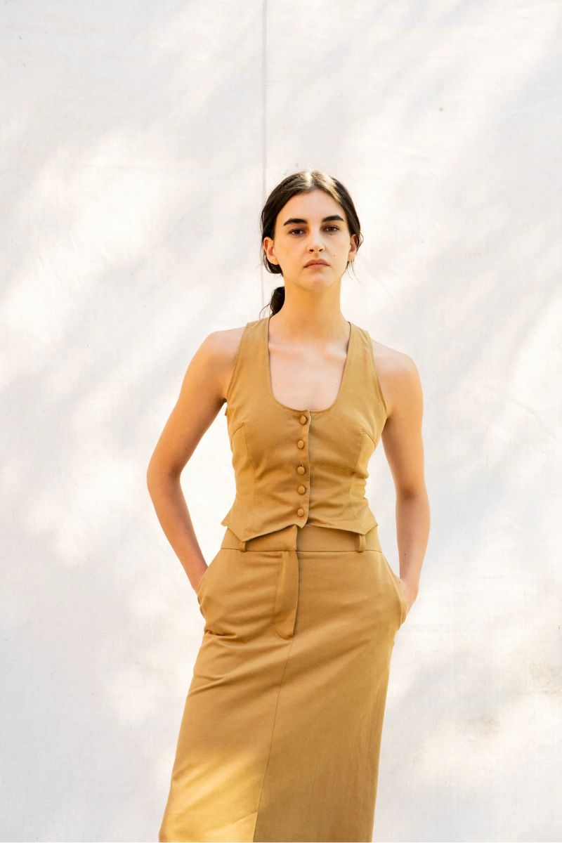 Crafted with precision, the Golden Bogota Waistcoat from BODYBAG by Jude combines timeless style with modern flair. The self buttons and crimped back ensure a tailored fit. Detailed chest darts enhance structure, flattering every body shape. Also available in versatile Navy, it pairs effortlessly with casual or formal outfits such as the Bogota Skirt.