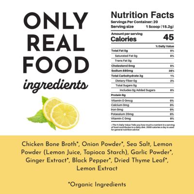 | Ingredients | • Chicken Bone Broth* • Onion Powder* • Sea Salt • Lemon Powder (Lemon Juice, Tapioca Starch) • Garlic Powder* • Ginger Extract* • Black Pepper* • Dried Thyme Leaf* • Lemon Extract *Organic Ingredients |