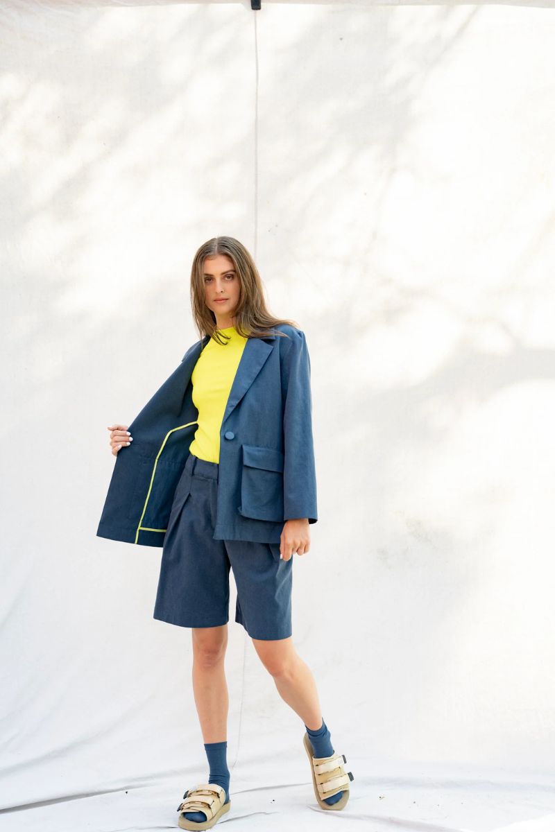 Ideal for eco-conscious shoppers, this blazer merges ethical production with versatile design. Pair it with BODYBAG by Jude’s Navy Bogota Bermudas and Lime Tipaza T-Shirt for effortless style or polished professionalism.