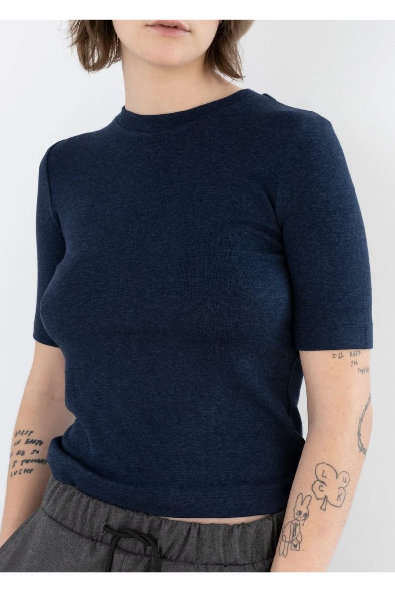 The fitted silhouette and classic round neckline create a polished look that complements every body type. Available in five sophisticated hues— black, vanilla, forest-green, red-wine, and indigo—this t-shirt pairs seamlessly with jeans, skirts, or layered under blazers. Its versatility transitions effortlessly from casual daytime outfits to elevated evening ensembles.
