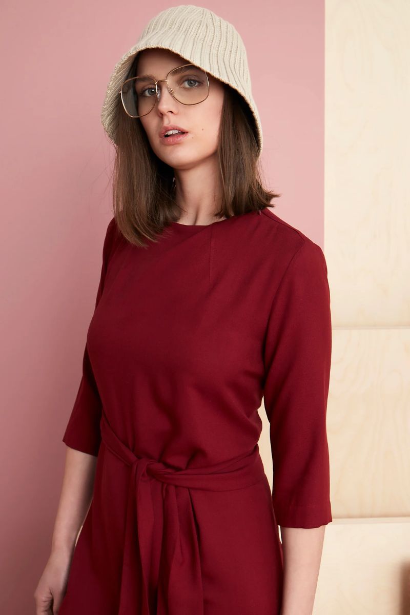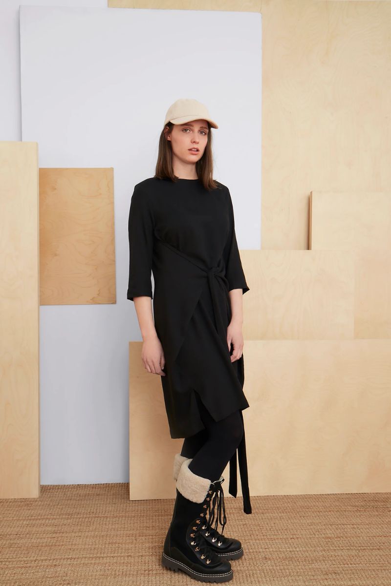 Wrap yourself in sophistication with this 100% viscose dress featuring a 3-way tie design, round collar, and 3/4 sleeves. Ethically designed and manufactured in Montreal, Canada, supporting local craftsmanship, leading to fostering the nation’s economy. Perfect for any occasion, the above-the-knee cut and side splits offer effortless movement, while the soft fabric ensures all-day comfort. Choose from timeless Black or rich Red Wine for a look that transitions seamlessly from day to night.